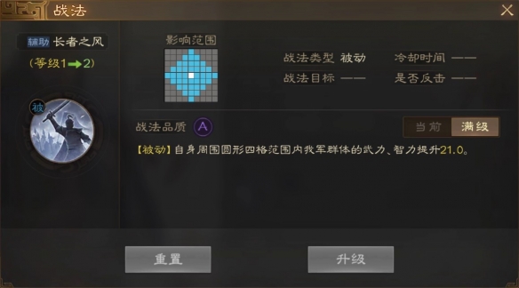 [被动]自身周围圆形四格范围内我军群体的武力。智力提升21.0。