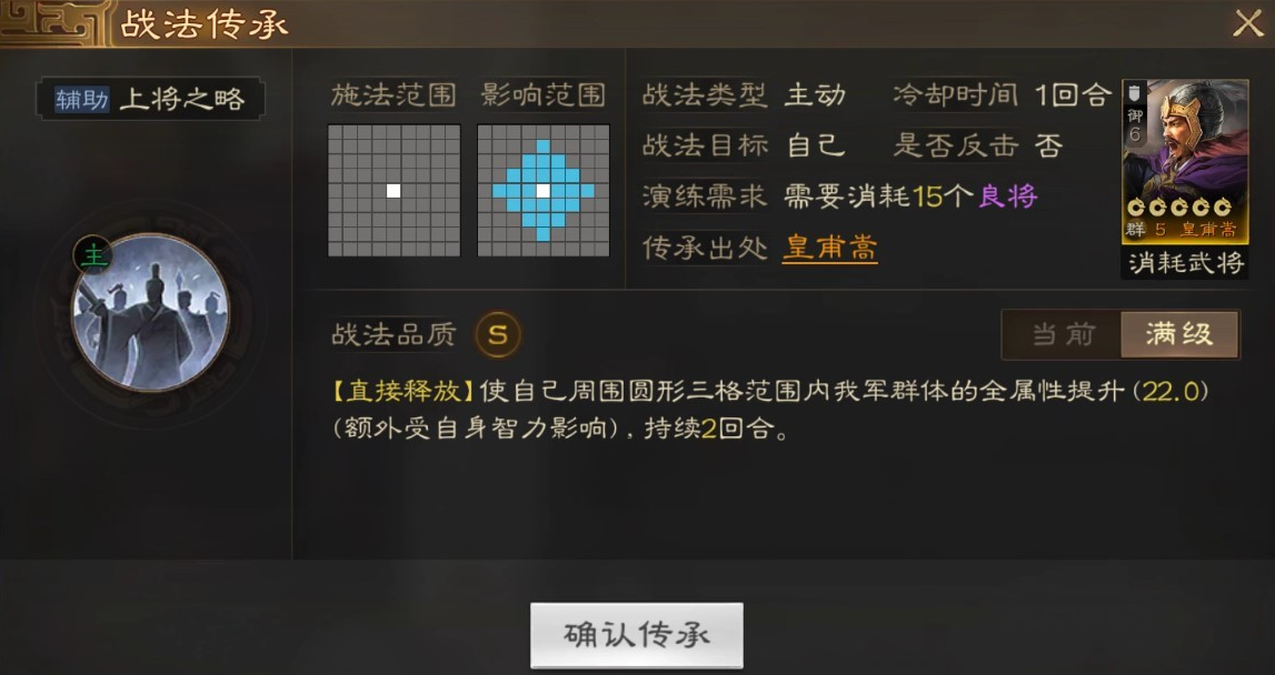 [直接释放]使自己周围圆形三格范围内我军群体的全属性提升(22.0)