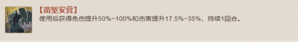 使用后获得免伤提升50%~100%和伤害提升17.5%~35%,持续1回合。