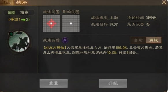 为我军单体恢复兵力,治疗率76%~152%,且受智力影响。若其身上有增益状态,则额外附加免伤提升5%~10%,可叠加,持续1回合。