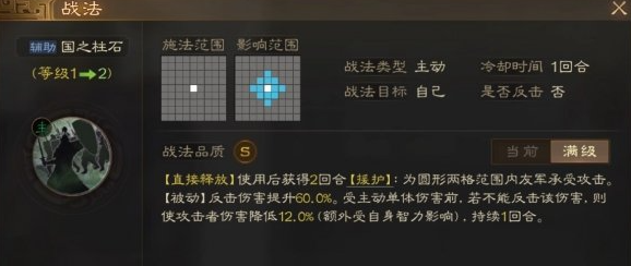 [被动]反击伤害提升60.0%。受主动单体伤害前,若不能反击读伤害,则使攻击者伤害降低12.0% (额外受自身智力影响)。持续1回合。