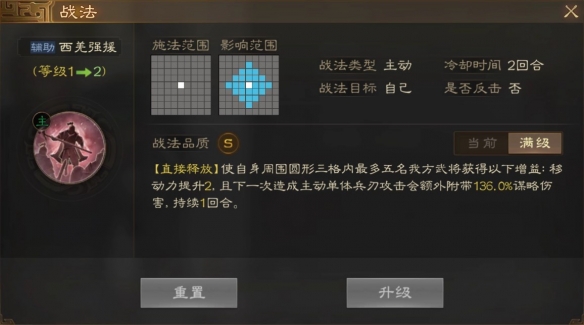 [直按释放]使 自身周围圆形三格内最多 五名我方武将获得以下增益:移动力提升2.且下一次造成主动单体兵7攻击会额外附带136. 0%谋略伤害,持续1回合。