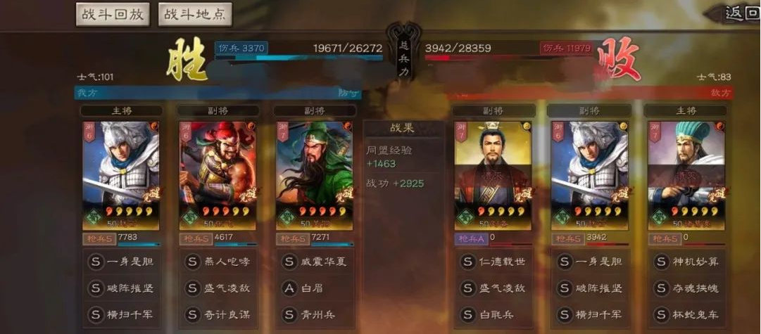 图上的是青州五虎枪,如果配合箕形阵防御能力将会更上一层。我个人配置是让关羽带横扫,利用关羽的速度优势先手打出联动效果。同时,赵云的技能选择可以更短平快一点,比如纵兵劫掠之类。后续赛季的据水断桥和绝其汲道也是对五虎枪巨大的提升。