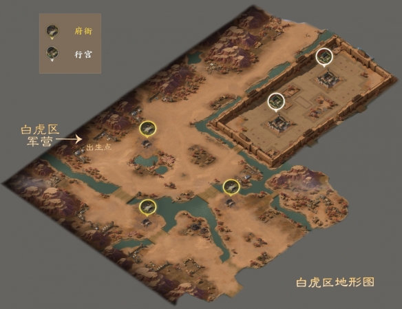 白虎区位于【逐鹿之邑】西侧,主西极庚金,延续了西凉的地貌,戈壁为主较为荒凉。一座府衙就在出生点门口,另外两座府衙需过桥。