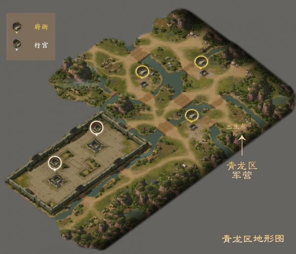 青龙区位于【逐鹿之邑】东侧,主东华乙木,延续了江东的地貌,小桥流水,翠色清明。一座府衙就在出生点门口,另外两座府衙需过桥。