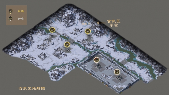 玄武区位于【逐鹿之邑】正北,主北冥葵水,延续了北方地貌,白雪皑皑,河流结冰。一座府衙就在出生点门口,另外两座府衙需过桥。