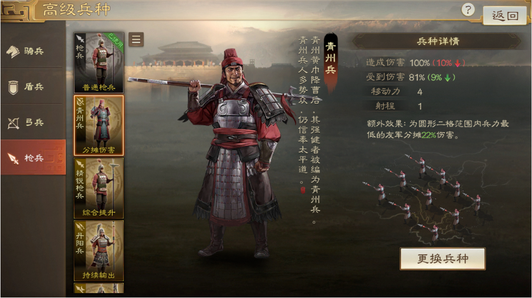 造成伤害 ↓10%;受到伤害 ↓9%;为圆形二格范围内兵力最低的友军分摊22%伤害。也就是前排承伤定位的枪兵。