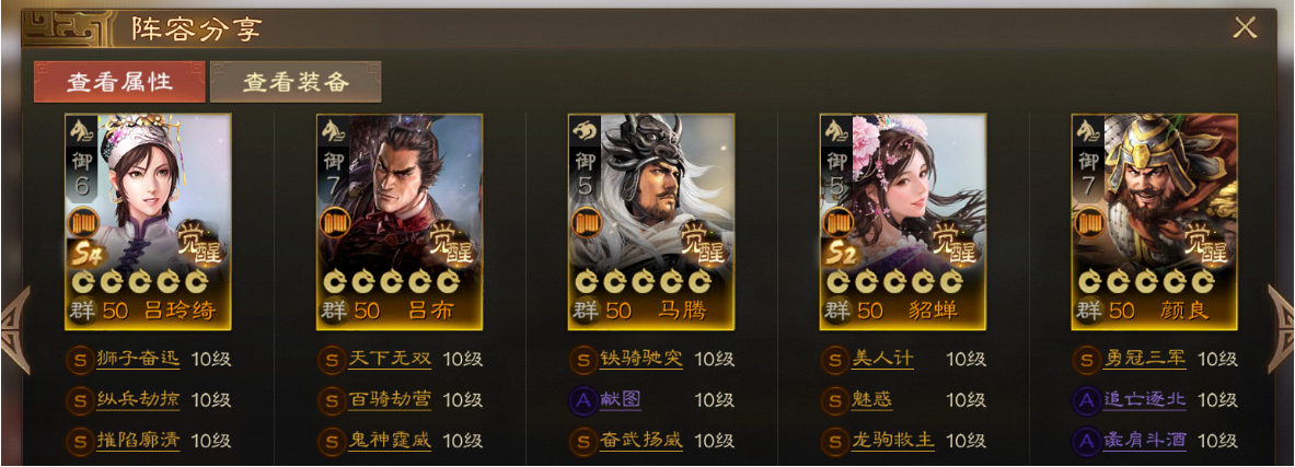 吕布父女冲锋打伤害,找机会能秒杀的直接秒杀,打不死的交给华雄收割,颜良为团队提供充足的控制,马腾持续给团队增伤和移动,队伍整体输出&机动拉满。
