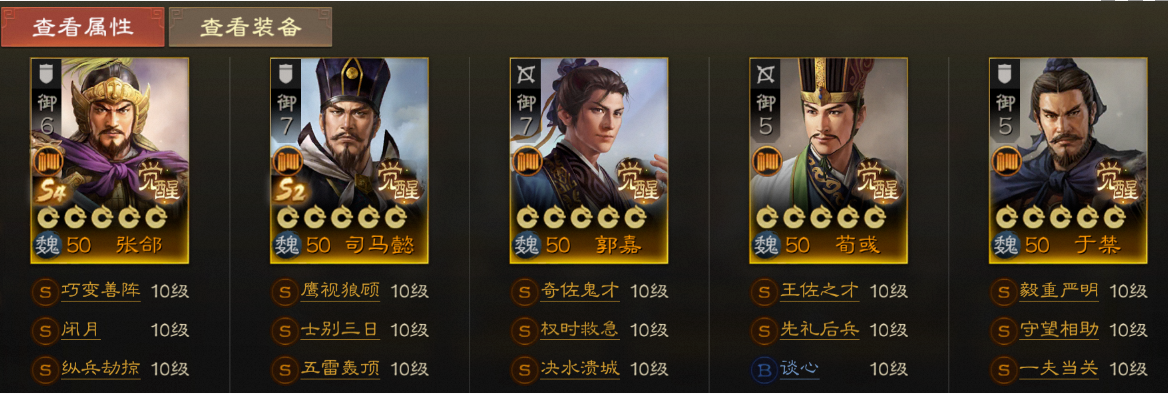 打法思路:开局后,获得【王佐之才】的司马懿在于禁的保护下踩阵试探,此时对方上前消耗,张郃找机会切入腹地使用【巧变善阵】打出伤害且群体"定身"与吸统,随后郭嘉在定身位置不断释放【决水溃城】,配合司马懿第三回合的爆发把范围内敌军一波带走。