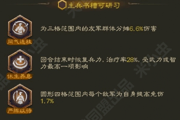 休养生息:回合结束时,恢复兵力,治疗率2.8%,受武力或智力最高一项影响