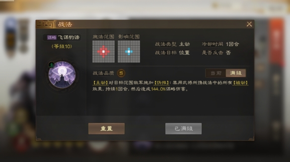 钟会自带战法【飞谋钓谤】:对目标范围敌军施加【伪报】:禁用武将所携战法中的所有【被动】效果,持续1回合,然后造成144%谋略伤害。