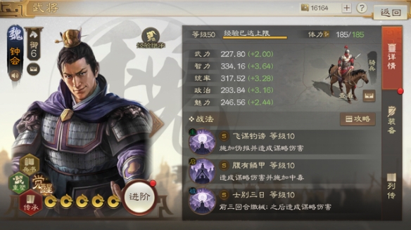 钟会,魏国6御骑兵,智力成长比较优秀,统率成长也算是中等水平,由于是谋略武将,武力虽然只有2的成长但也无伤大雅。