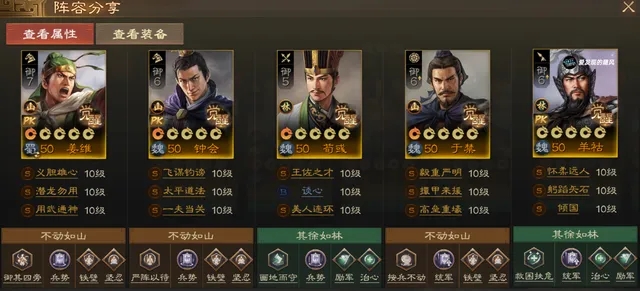 后起之秀羁绊,从蜀国转姜维过来,姜维、钟会、羊祜三个人凑后起之秀羁绊,第四第五人选择于禁和荀彧。荀彧王佐之才给姜维,同时带谈心给姜维提升属性,美人连环是献图PLUS版,羊祜再补一部分的恢复。这里钟会也可以换邓艾,当另一个输出。