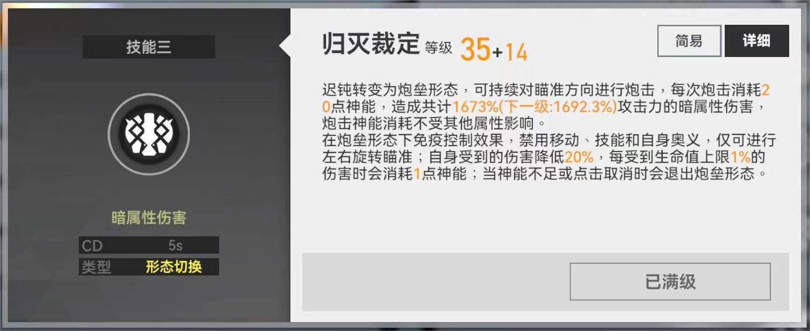 迟钝转变为“炮垒”形态,可持续对瞄准方向进行炮击,每次炮击消耗20点神能,造成共计750%~1596.1%攻击力的暗属性伤害。在“炮垒”形态下,自身受到的伤害减低20%,免疫控制效果,但无法移动或施放除连携奥义外其他技能,仅可进行左右旋转瞄准,每受到最大生命值1%的伤害时会消耗1点神能。当神能不足或点击取消,“炮垒”形态将会自行解除。