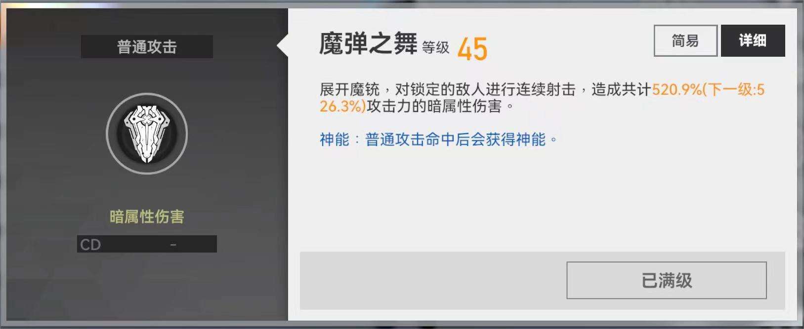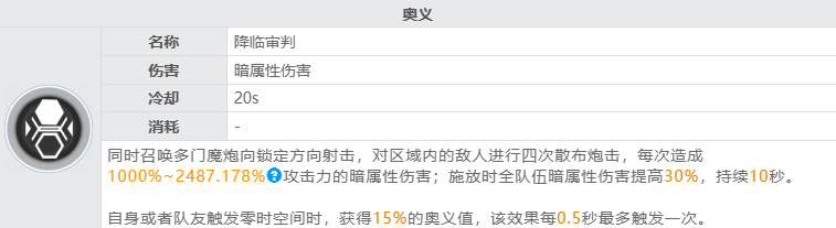 1.展开魔铳,对锁定目标进行连续射击,造成共计280%~520.9%攻击力的暗属性伤害。