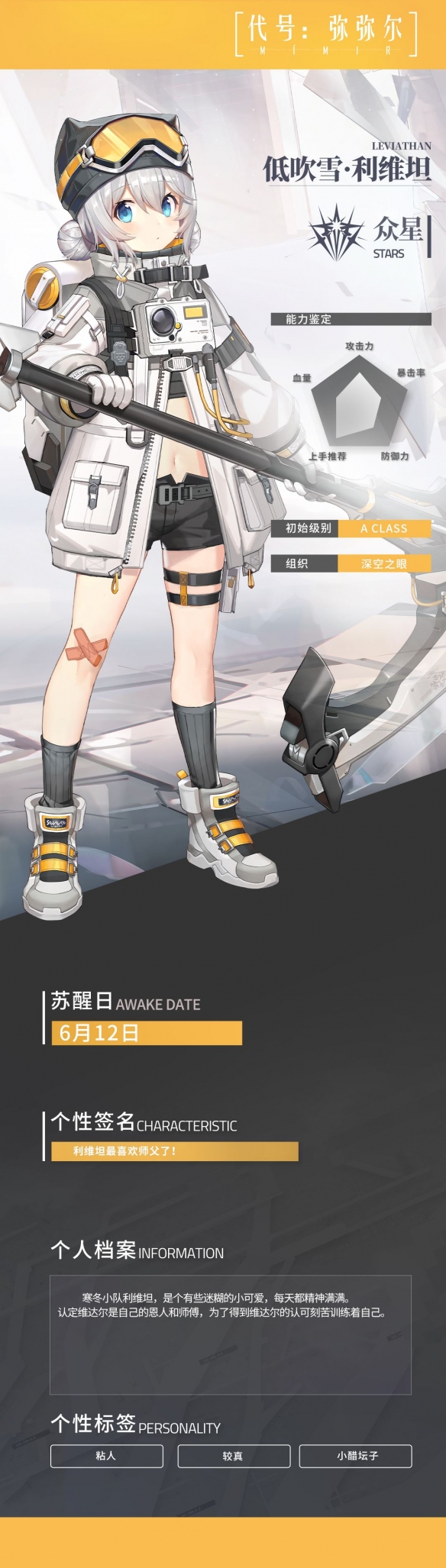 每天都精神满满的利维坦,是个偶尔会犯迷糊的小可爱。虽然性格天真活泼,但意外的是个小醋坛子,请不要在她面前和维达尔表现得太过亲密。