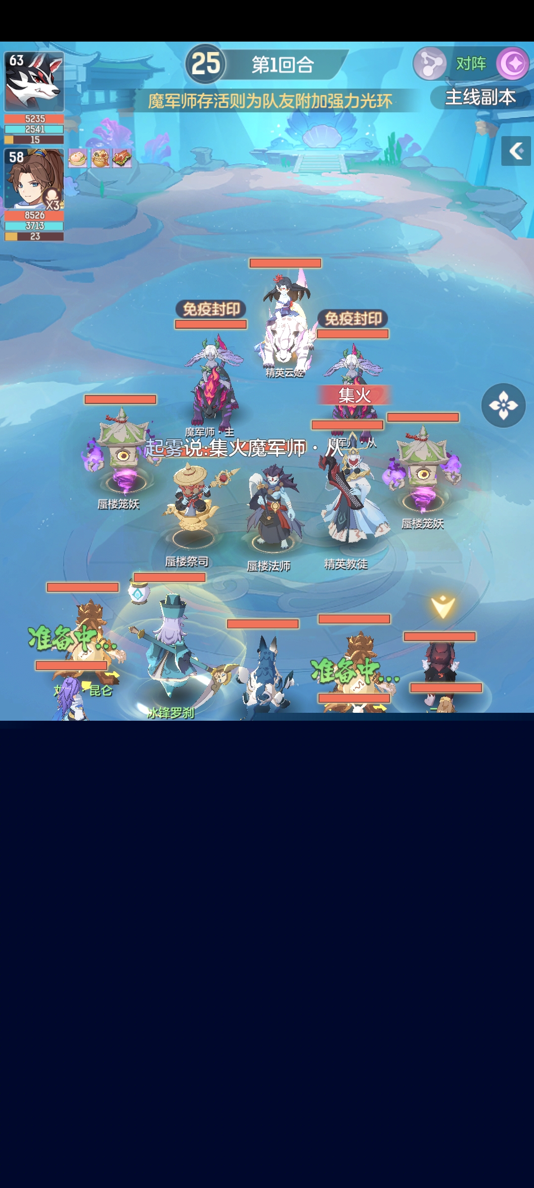 ·打法:第一回合封控制对面教徒,奶妈可以选择加伤害或者金钟罩控制对面祭司,集火1魔军师·主(杀了它就不会给主怪加连击buff,这点尤其重要,不先秒它可能会面临灭队),集火2魔军师·从(杀了它就不会给少血的怪加盾啦),集火3精英云姬。