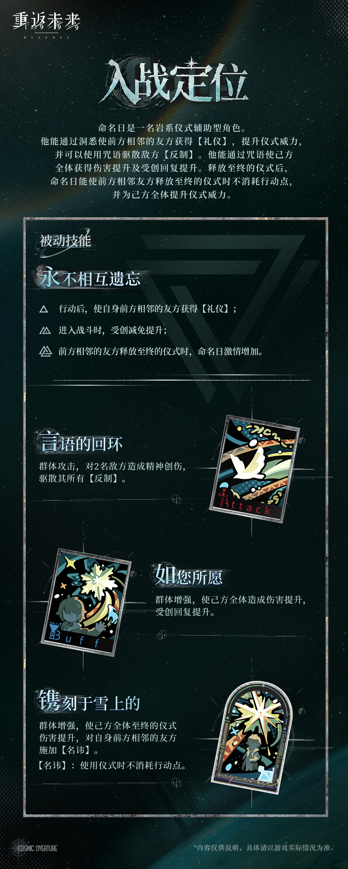 礼仪系统:战斗开始时为相邻队友叠加【礼仪】(最多100层),提升仪式威力;队友释放仪式后消耗【礼仪】并使命名日激情+1.