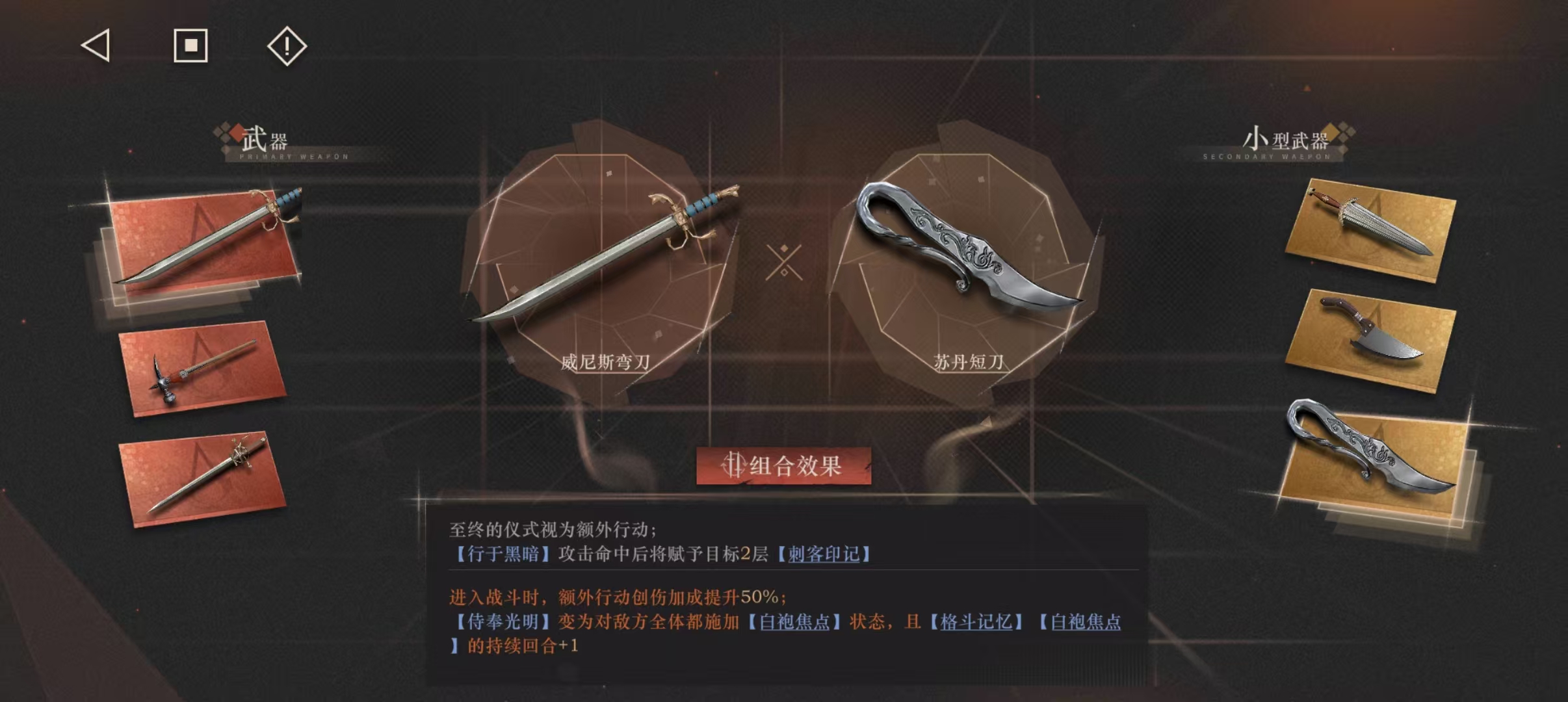 武器选择:主武器威尼斯弯刀+副武器清杂选屠刀,无生存压力选短刀,高压选五指剑