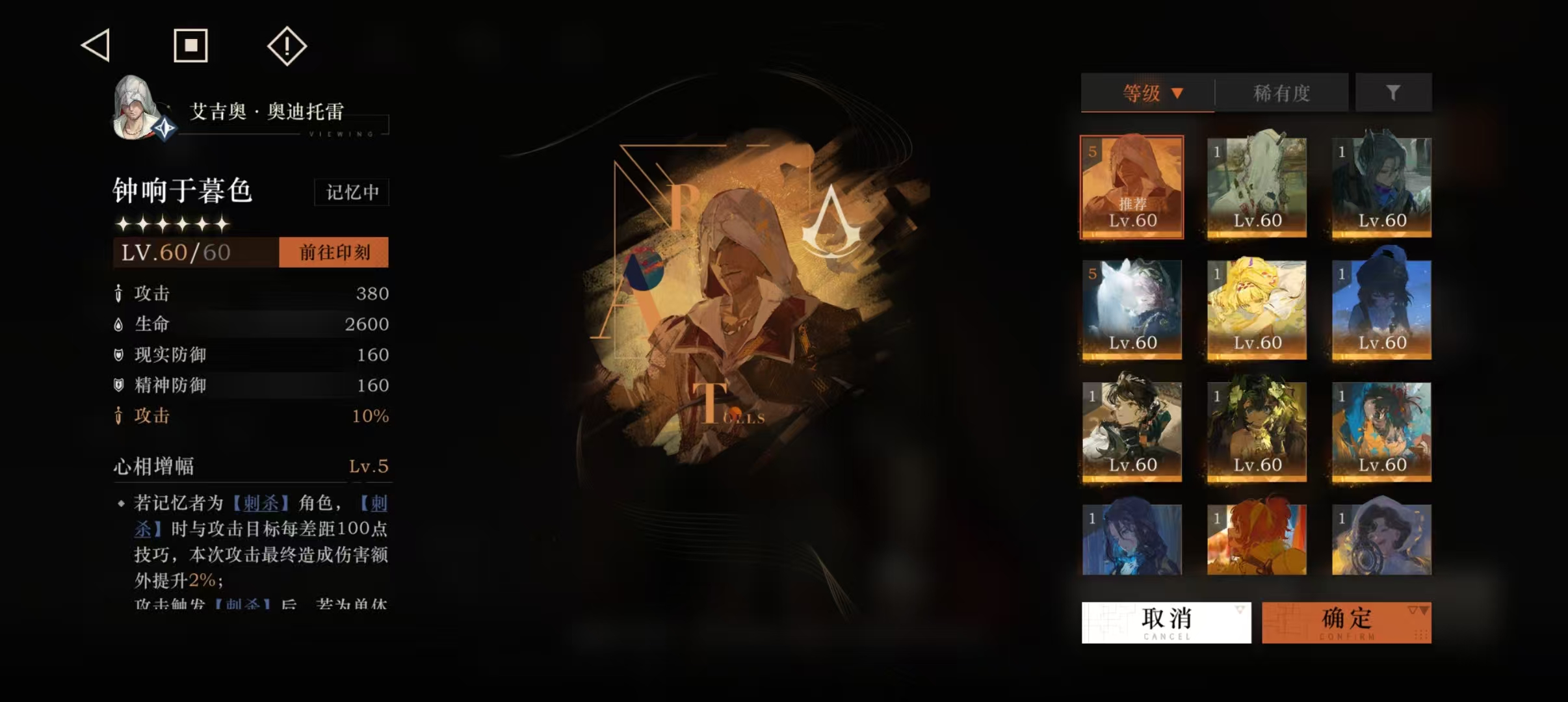 95%的情况下都可以无脑选择专属心相钟响于暮色,进入追击队可侯选曲娘专武或纸信圈儿专武,进入仪式队也可选择冷周六专武,进入毒队优先选满增幅的落于现象优于艾吉奥自身专武