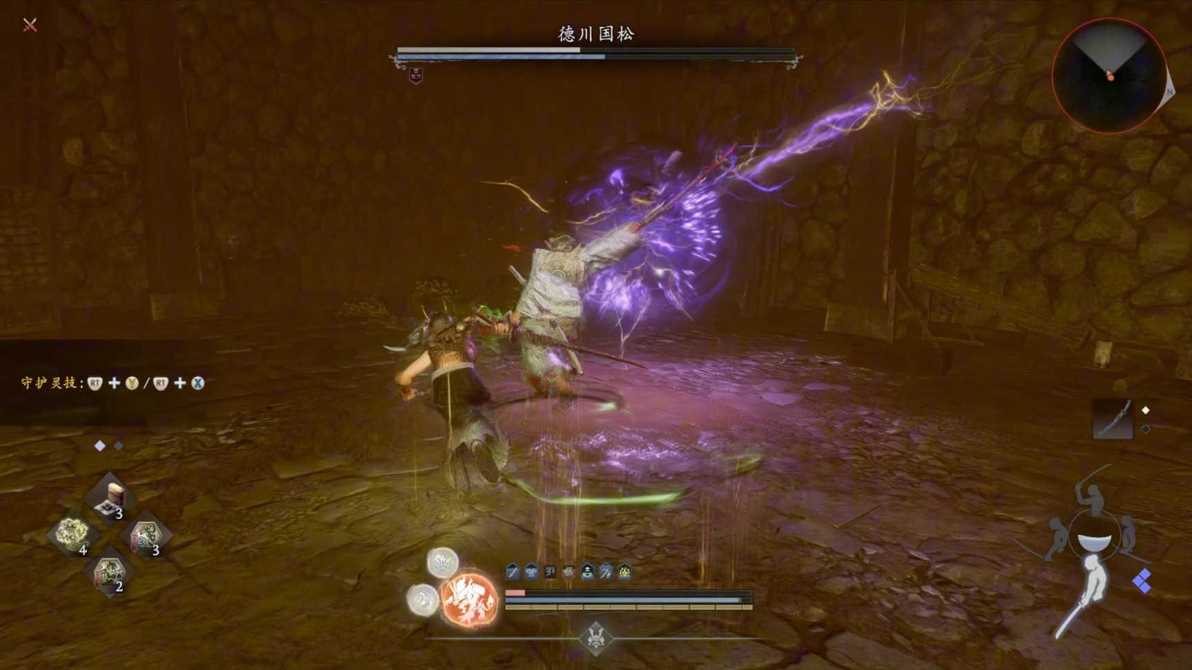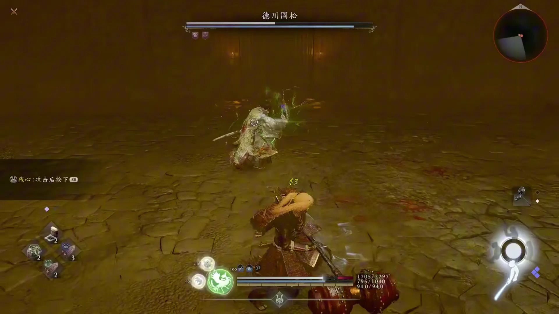 战斗开始时,建议绕背并向BOSS背部投掷几枚手里剑,随后用一套近战连招打背击。此战主要需要依靠近战攻击并专注于闪避BOSS招式。掌握BOSS的攻击模式,找到正确的闪避时机。值得一提的是,BSOS的剑击范围不远,很容易通过向后闪避来躲开,这一点与其他BOSS通常需要向前闪避绕背不同,直接后撤让BOSS打完剑击连招即可。