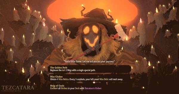 上方图片中所展示的先古之民是特兹卡塔拉,或称饲火者。这位先古之民是黑暗尖塔中一道温暖而善良的光,其祝福通常都会大放光芒但也会迅速燃尽。举例来说,图中显示的祝福有一个会将当前阶段的地图改变为一条特别的路线;一个能给予你一些临时的遗物;还有一个则能将你所有打击牌费用降低,但同时让它们无法从牌组中被移除。