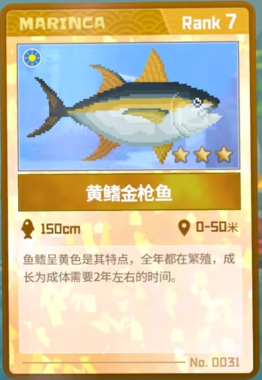 捕捉方法:一般可以在0-50米处发现,因为黄鳍金枪鱼体型比较大,所以需要使用催眠枪,催眠之后再用无人机拉走。