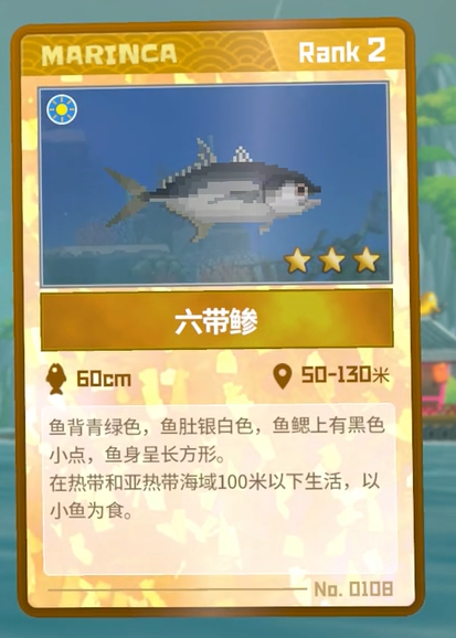 捕捉方法:六带鲹作为肉食类鱼,分布较为广泛,热带和亚热带浅海区域均有分布,玩家可以通过网枪或消音飞镖将其捕获。