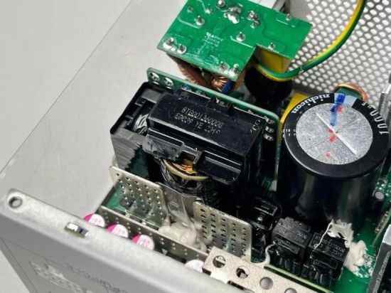 向下移动,我们可以看到电源搭配的全桥LLC谐振电路,可见两块金属散热片用于散热。