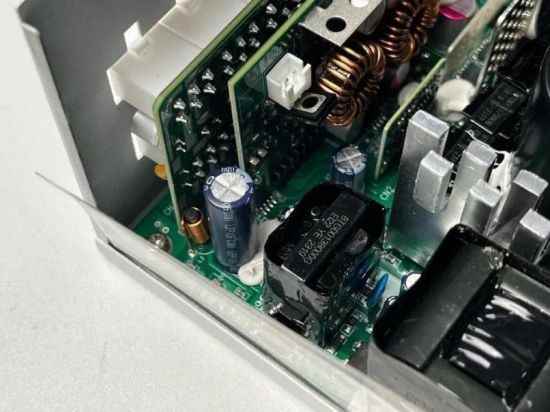 在中间位置,我们可以找到PFC电路的主电容,采用了日本制造的105℃主电容。该电容具有低纹波、高阻抗和长寿命的特点,非常适合对稳定性和可靠性要求较高的电路。在电源输出高功率的情况下,日系电容的高耐久性能能够让用户更加放心地使用。