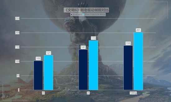 「文明6」 第二款测试游戏为《文明6》,这款游戏作为战旗策略类游戏,实际上对硬件性能的要求并不高,而且相对来说处理器的性能更加重要。不过,更高的帧数对于玩家来说自然是“有比没有”的好。 这部分测试,我们分别进行了平均帧和帧像周期的对比,前者很好理解,后者实际上就是帧生成时间,也就是生成每一帧之间的时间间隔,时间越短,画面感受越流畅。 首先来看帧数对比,4972版驱动中,4K分辨率平均帧102fps,2K平均141fps,1080p平均155fps;升级新驱动之后,4K分辨率提升到121fps,2K提升到173fps,1080p提升到201fps,最大提升幅度约30%!