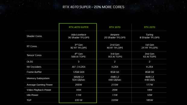 其中RTX 4070 Super显卡采用AD104-350核心,CUDA核心数量增加1280个达到7168个,基准频率增至1980MHz,加速频率仍维持2475MHz不变。显卡二级缓存为36MB,显存还是12GB 192-bit GDDR6X显存,整卡功耗从200W增至220W。