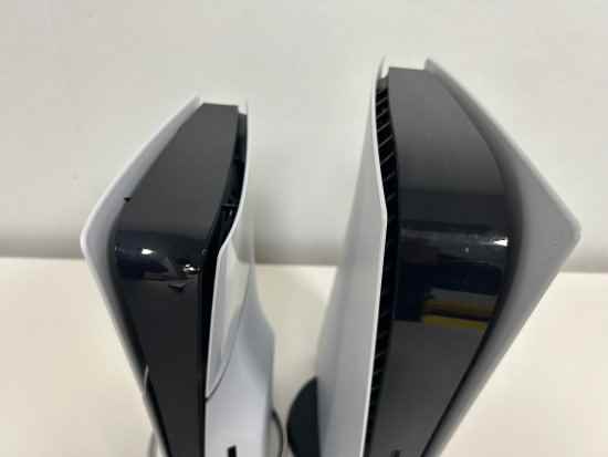 除了这些外观上的变动外,轻薄版PS5和老款差异最大的部分,还得是大小方面了。从体积上来看,轻薄版PS5要比老款小30%,两款主机摆在一起能看出整整小了一圈,其重量也从最初版的4.47千克下降到了3.16千克,就我个人来说在搬运或携带轻薄版机器时,用一只手拿起来也能毫不费力。