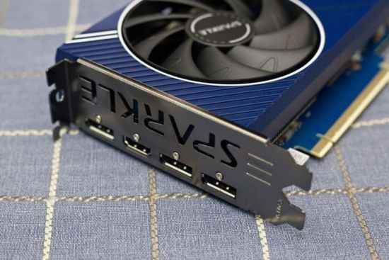 显卡侧面是“SPARKLE”的LOGO灯,它带有额外的温度传感器以及ThermalSync技术,显卡在工作的时候会根据温度实时变换不同颜色的灯光,玩家们可以在不开启任何辅助软件的情况下随时观察到显卡的温度状况。
