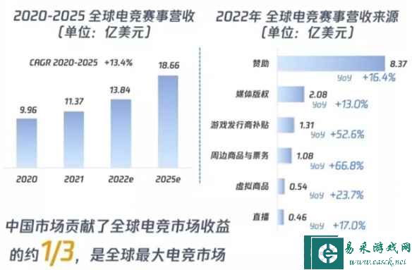无独有偶,国家体育总局近日公布了杭州亚运会电子竞技国家集训队名单,共包含英雄联盟项目25人和和平精英项目16人。两个项目的集训选手都是在今年春季赛取得不俗成绩和表现的明星选手,这不由让人回忆起2018年雅加达亚运会上中国电竞代表团取得了两金一银的好成绩,让国内玩家为之激动不已。而此次杭州亚运会共有多款电竞项目:《和平精英亚运版本》、《王者荣耀亚运版本》、《炉石传说》、《梦三国2》、《刀塔2》、《FIFA Online 4》、《英雄联盟》、《街霸5》。而毋庸置疑的是,如今,中国已成为全球最大的电竞市场。《2022年亚洲电竞运动行业发展报告》显示,2022年全球电竞观众增至5.32亿,全球电竞赛事营收规模达到13.84亿美元,中国从用户到流水贡献约达到全球的三分之一。