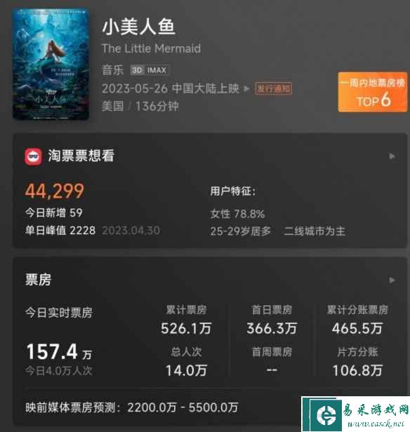 《小美人鱼》创下了迪士尼真人童话电影在中国内地最差开画票房纪录,与以往的迪士尼真人童话电影有着明显差距!猫眼等平台对该片总票房的预测已经降至4000万左右…