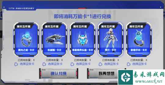 通过抽取卡片,各位玩家可以收集到:溯光之戒-卡片、机械鲲-卡片、苍蓝视界头盔-卡片、图兰-卡片、影锻手环-卡片,以及万能卡、沾沾卡。 其中万能卡可以兑换任意一张卡片,而沾沾卡可以随机沾到朋友的一张卡片,卡片可以相互赠送。