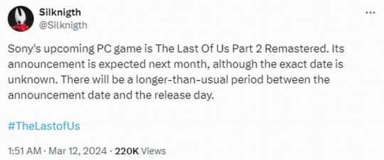 消息人士Silknigth此前曾准确爆料《对马岛之鬼》PC版,近日他又发推文称,索尼即将移植到PC的游戏是《最后生还者2:重制版》,该作将于4月公布,但具体日期尚不得而知。