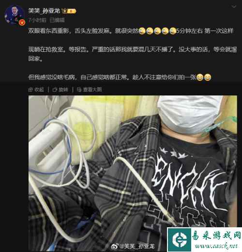 “双眼看东西重影,舌头左脸发麻。就很突然。5分钟左右。第一次这样。现躺在抢救室。等报告。严重的话那我就要混几天不播了。没大事的话,等会就溜回家。但我感觉没啥毛病,自己感觉啥都正常。”