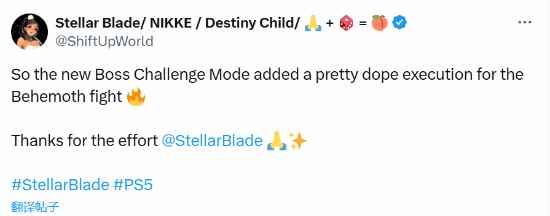 《剑星》于昨日发布了更新,增加了BOSS挑战模式和一些新服装。博主@ShiftUpWorld发文表示:“新的BOSS挑战模式为和比蒙狮的战斗添加了一个新的处决方式。”