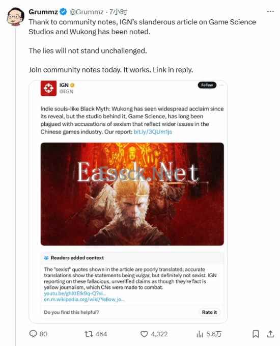 “这些翻译完全错误,是为了让工作室创始人看起来很糟糕。@Asmongold在视频中也提到了这个问题。我呼吁社区用注释来审查此事。”他还强调,社区推文的注释是对抗虚假叙述的有效方式,并建议更多人加入这一社区。 Grummz敦促IGN撤回其误导性报道,并警告说:“猴子在看着。”