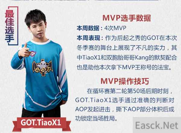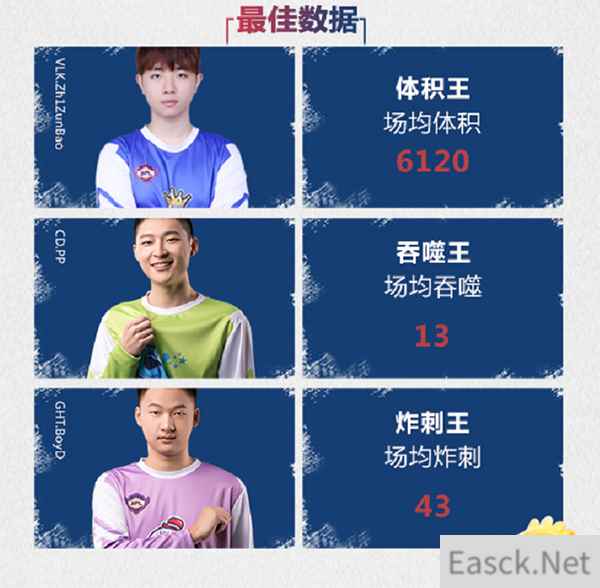 本周最佳数据依然是新秀、老将全面开花。体积王由一直势如破竹的VLK战队Zh1ZunBao拿下,CD的PP和GHT的BoyD则分揽吞噬王和炸刺王。MVP属于当之无愧的GOT队TiaoX1,状态颇佳的他带领队伍一路从上上周的榜四冲到榜一,并成功晋级胜者组第二轮。
