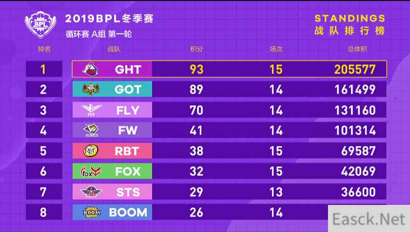 首周比赛,A组进行了两个比赛日的较量,吸纳了原TOP战队BoyD和SC战队QingTian的GHT如虎添翼, 稳居A组榜首,GOT、FLY也以压倒性的积分优势分占A组第二、三名,与后面的梯队逐渐拉开差距。