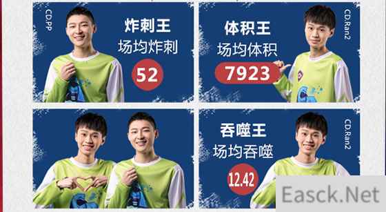 上周最佳数据被CD包揽,不得不说, 新赛季回归的他们真的状态满分,pp的炸刺发育和配合Ran2的进攻吞噬帮助战队顺利拿下四连胜。周最佳选手则由GHT的WuPuYan摘得,两个比赛日14场比赛共拿下4场比赛MVP。