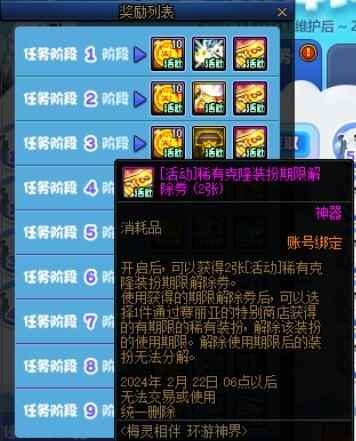阶段奖励中可以获得8张稀有克隆装扮期限解除券,可以将赛丽亚的特别商店中的期限稀有装扮升为永久稀有装扮。