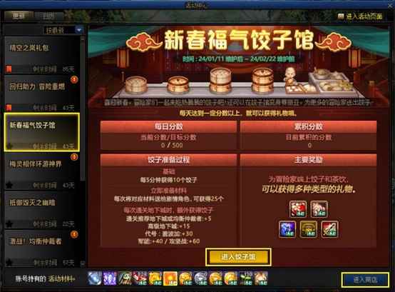 在活动时间内,玩家可以通过活动中心页面也赛丽亚房间活动NPC进入小游戏,根据小游戏成绩可获得饺子馆红包奖励,饺子馆红包可以在NPC商店中兑换各类奖励。