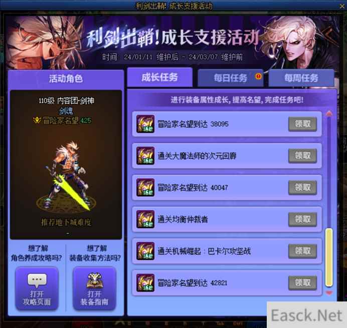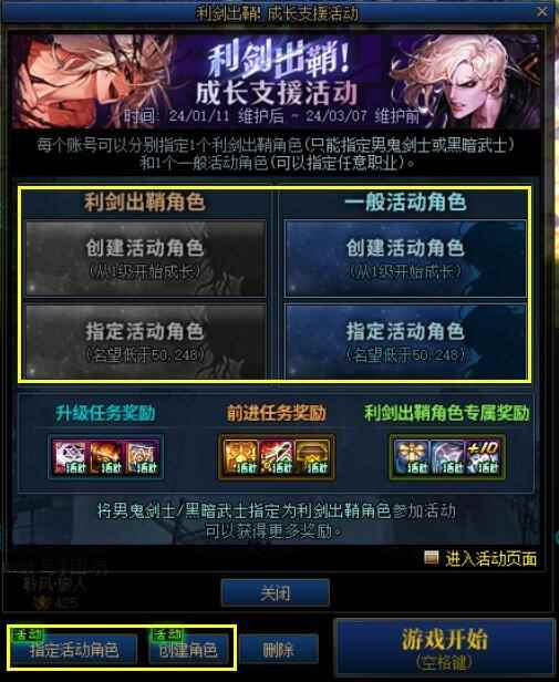 在活动时间内,玩家在角色选择页面绑定成长支援活动角色,既可以创建新角色作为活动角色,也可以将已创建且名望低于50248的角色作为活动角色。 可以绑定1个[利刃出鞘挑战角色]与1个[一般挑战角色]共计2个角色,[利刃出鞘挑战角色]有专属奖励,但职业限定为男鬼剑士或黑暗武士。