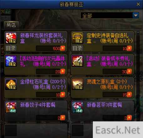 在活动时间内,玩家可以在赛丽亚的特备商店中使用极少的金币兑换各类奖励。 活动的核心奖励为雾核(神界深渊票)、晶体、期限稀有克隆装扮。 【二】新春福气饺子馆
