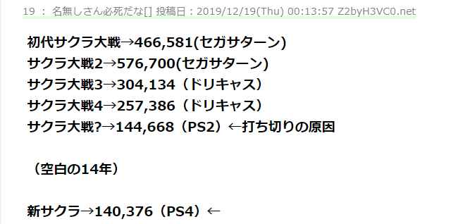 ·有玩家晒出了《樱花大战》系列旧作的首周销量,果然呈现不断下降趋势,甚至连当年那让世嘉放弃制作的最后一作销量也没赶上。惊呼老玩家们去哪里了? ·有玩家推测可能和本作主题有关,作为PS4的主力中韩玩家群体不会购买。