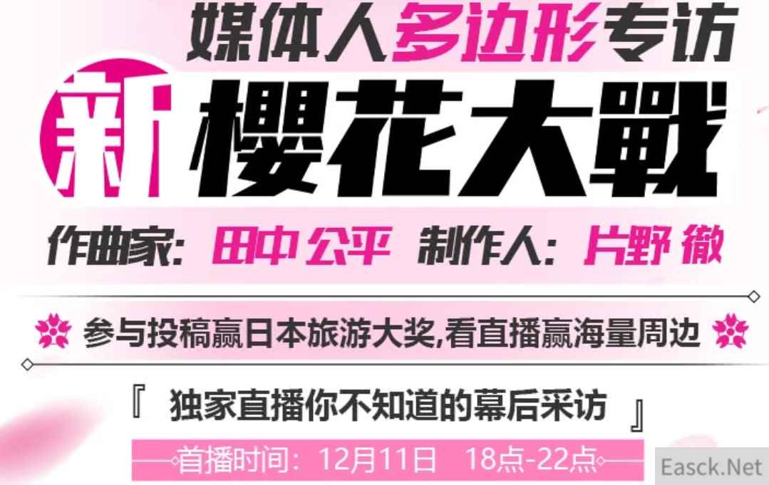 ·12月11日的18点~22点,《新樱花大战》的制作人片野徹和作曲家田中公平将做客企鹅电竞直播间,独家分享《新樱战》的更多内部消息,共同迎接《新樱花大战》的到来,而且企鹅电竞将在直播途中开启多次抽大奖活动,感兴趣的玩家不要错过了。 ·《新樱花大战》做客企鹅电竞直播间地址>>>>>